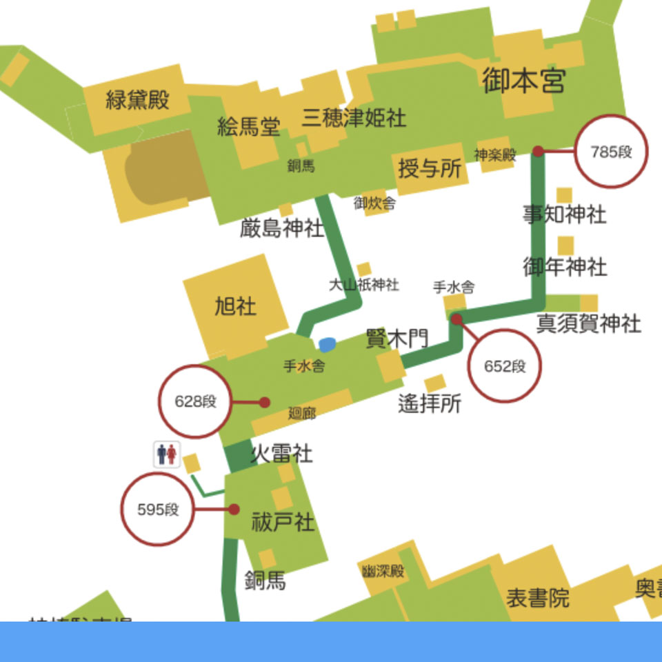 皆さまご承知のように当宮は御本宮まで785段、奥社までだと1368段。平地にある神社と違って当宮におまいりするには、皆が皆、言わずと知れた高く長い石段をクリアしなければなりません。