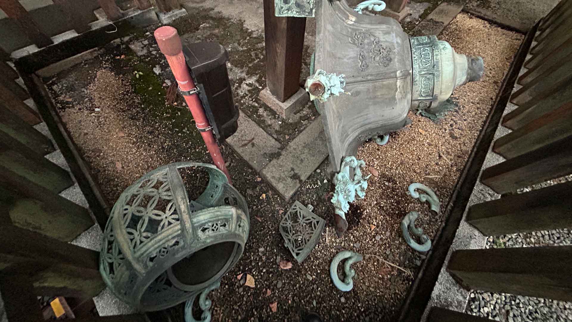 本年元日、新年のお参りの皆様で境内が賑わう中、三穂津姫社前の、国指定重要有形民俗文化財 青銅製灯籠が、若者の軽率な行為により倒壊し、蕨手飾りが折れるなどの被害が発生しました。