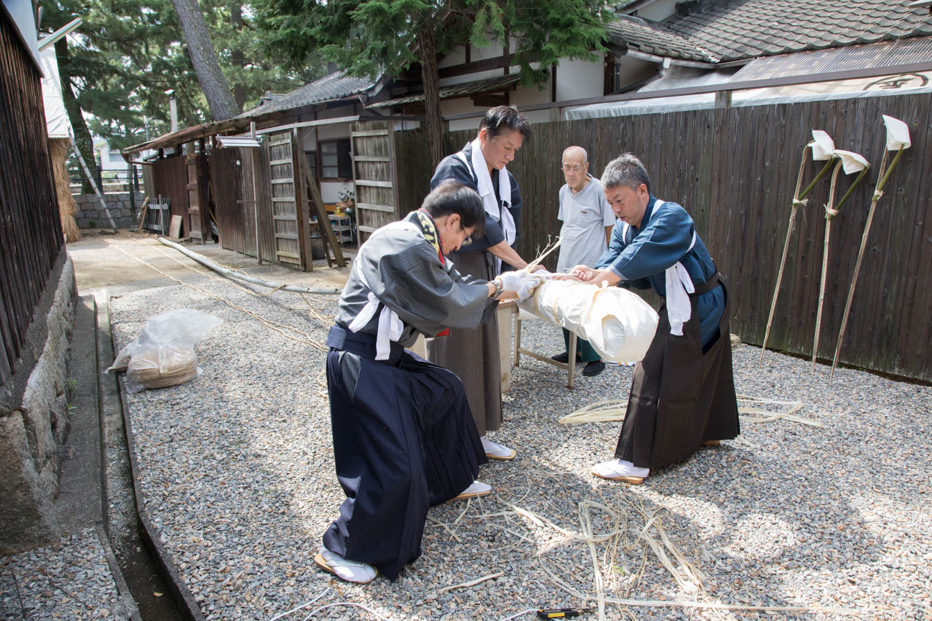9月10日、祝舎にて「入宿神事」を齋行します。昔は、この日からお頭人さんが祝舎での精進潔斎の生活に入りました。現在では、祝舎係がお頭人さんに代わって奉仕します。