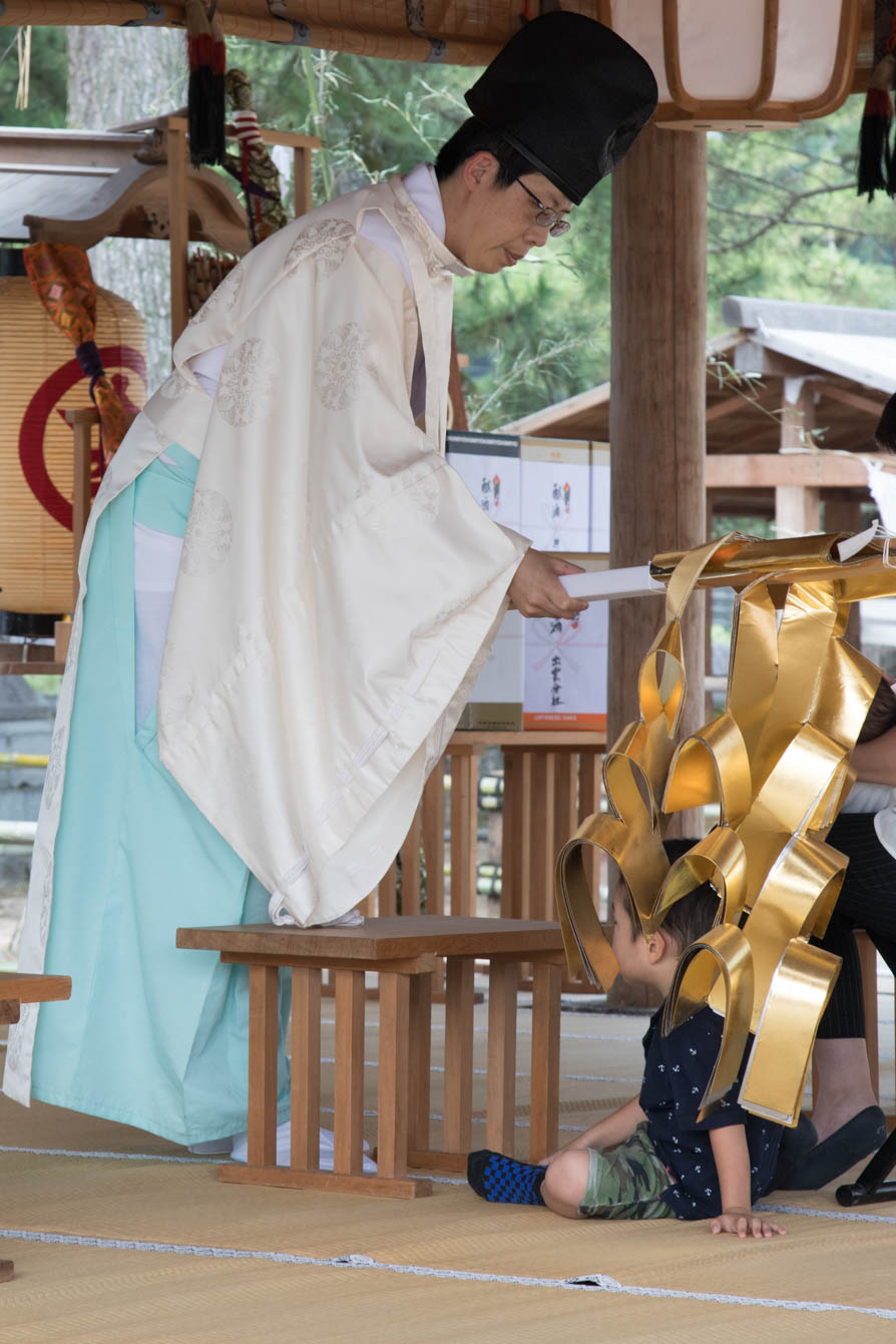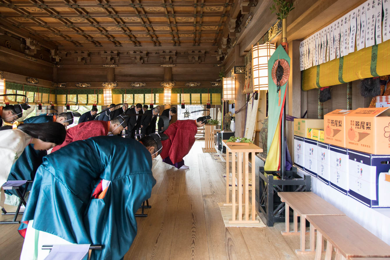 その期間は、「祝舎(いわいや)」での神事も含め、8月31日の口明神事から10月15日の焼払神事まで46日間にもわたります。主要な祭典である「宵宮祭」「御本宮 例祭」「御神輿渡御」は10月9日〜11日の3日間に齋行します。