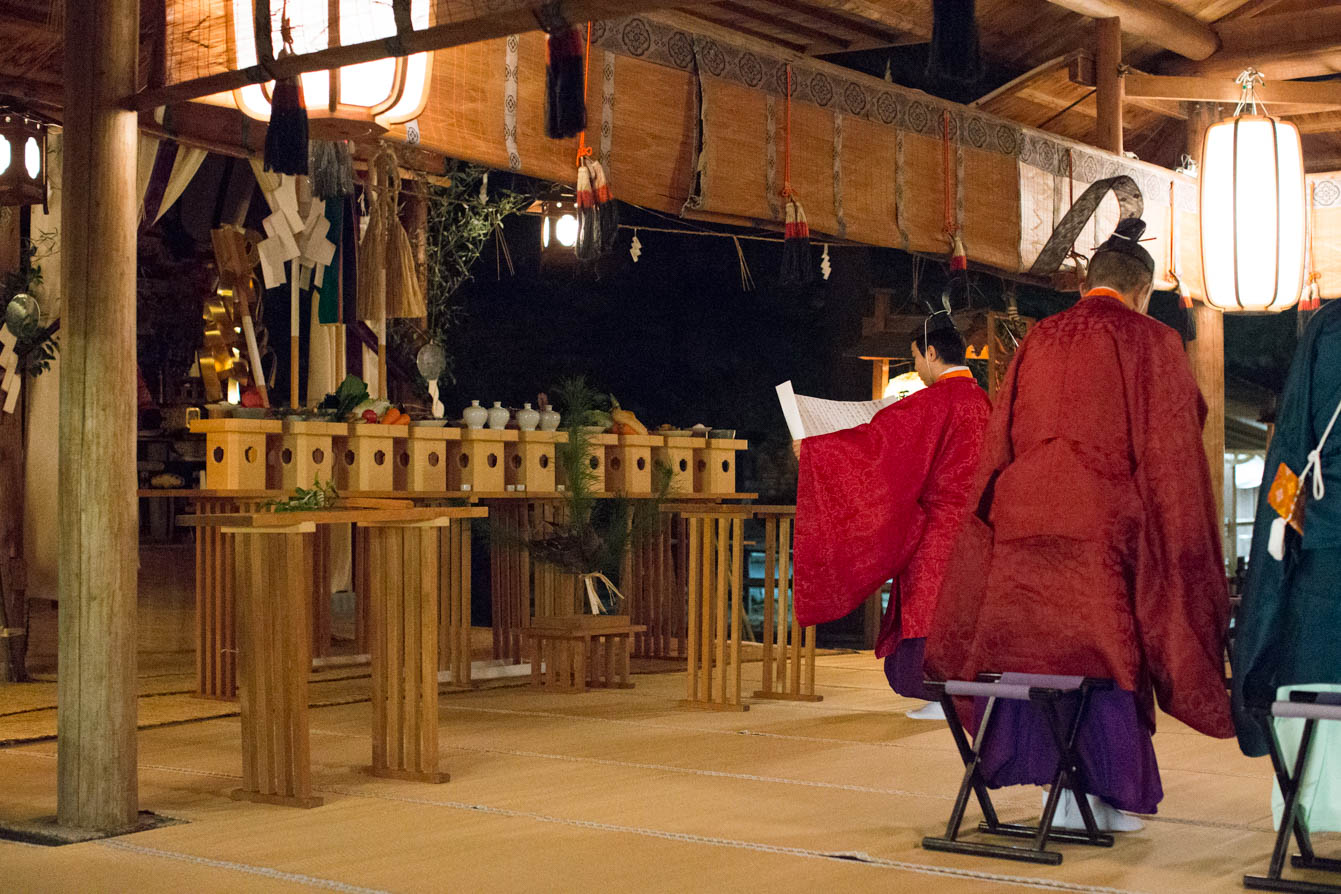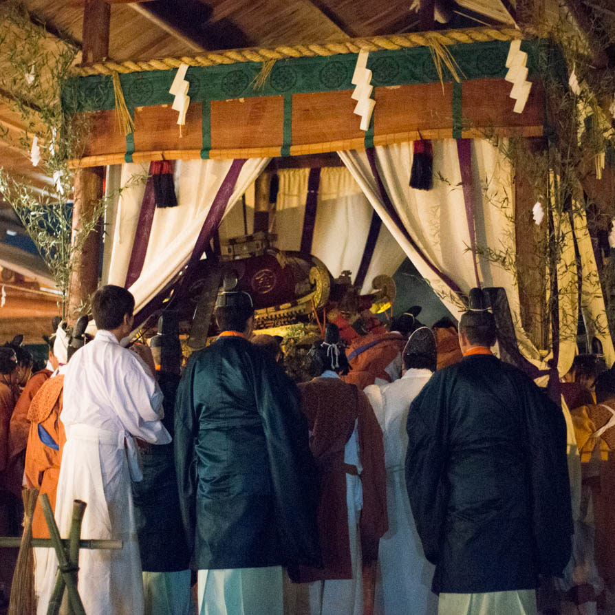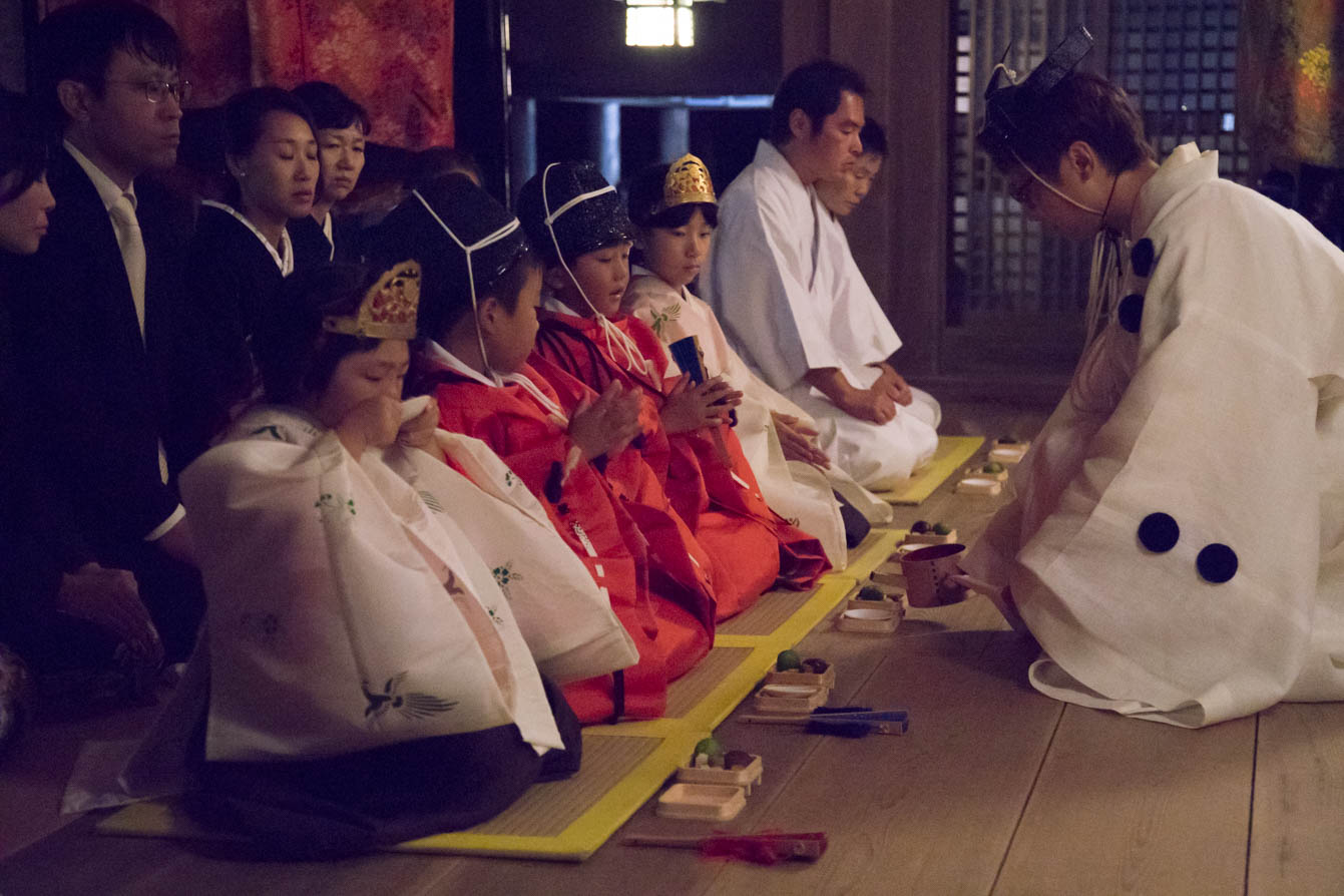 深夜、御神事場の行宮において「行宮着御祭」を齋行します。祭典では大和舞(神主舞・諸司舞)を奏進します。