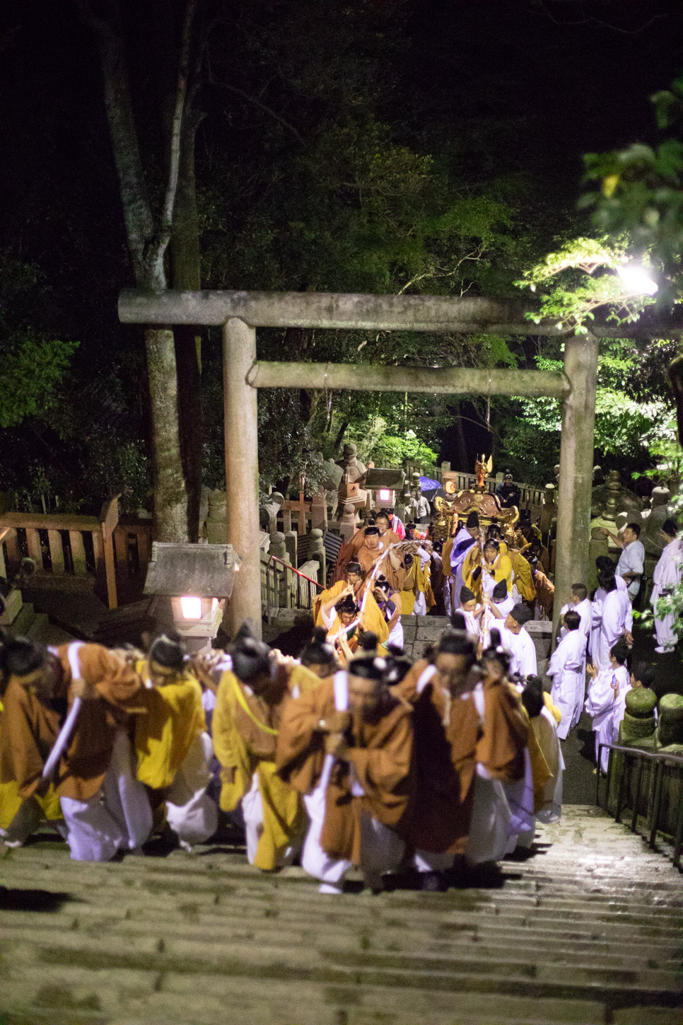午後9時、御本宮から御神事場まで御神輿が渡御いたします。先供の奴組、乗馬の男のお頭人さん2名と駕篭の女のお頭人さん2名を中心とした頭人行列、猿田彦、道太鼓、講員、敬神婦人会、氏子総代、庄官、五人百姓、祝舎神職、神馬、巫女、舞人、太玉串、伶人、御神宝、啓行員、御紫翳、御神興、御菅翳、御絹傘、御錦蓋、御菅蓋、宮司以下神職、祭員など、数百名が行列を整える御神幸です。約2キロメートルの道のりを2時間かけて進みます。道太鼓が凜々と鳴り渡る沿道は、奉拝者のみなさまで賑わいます。