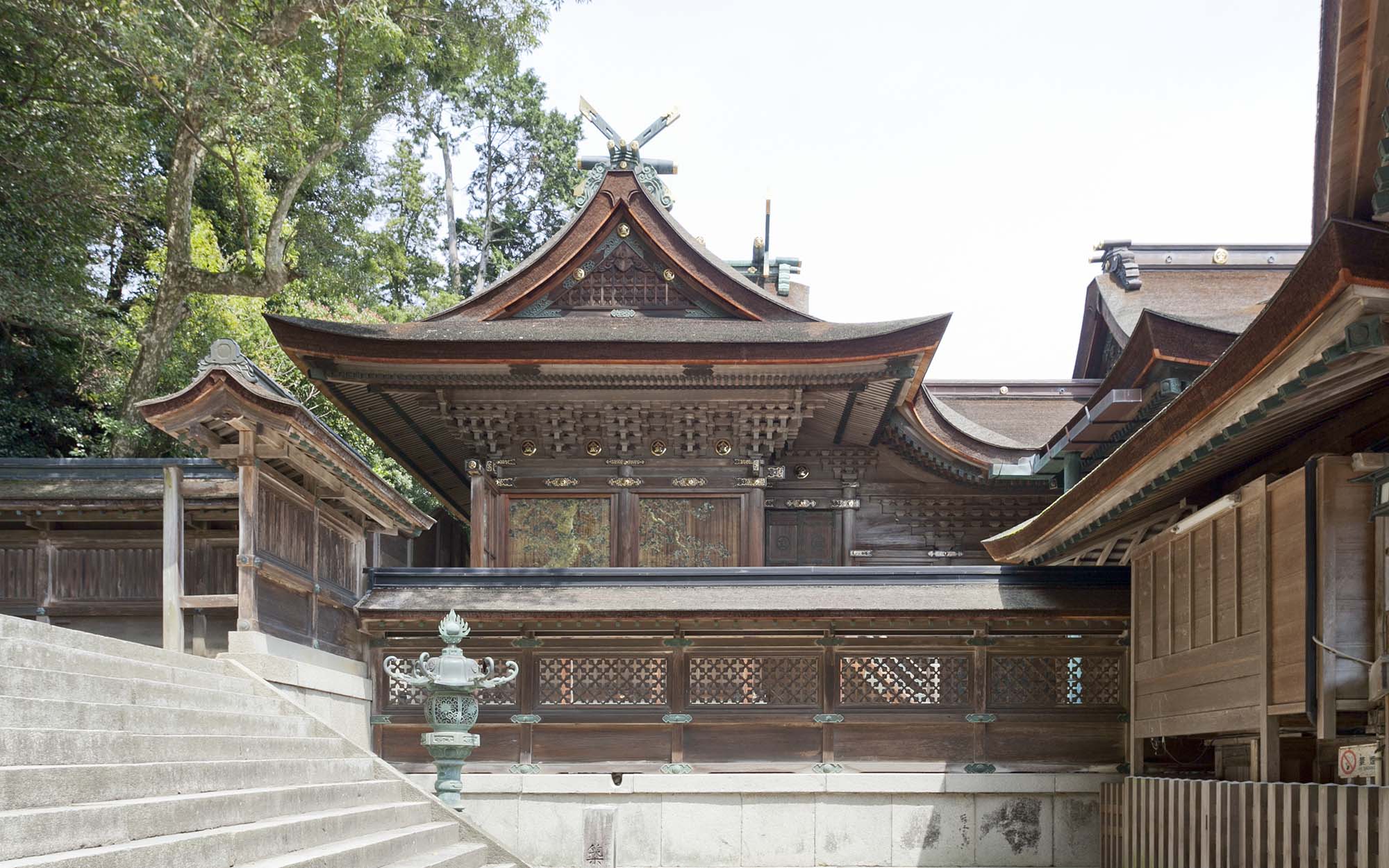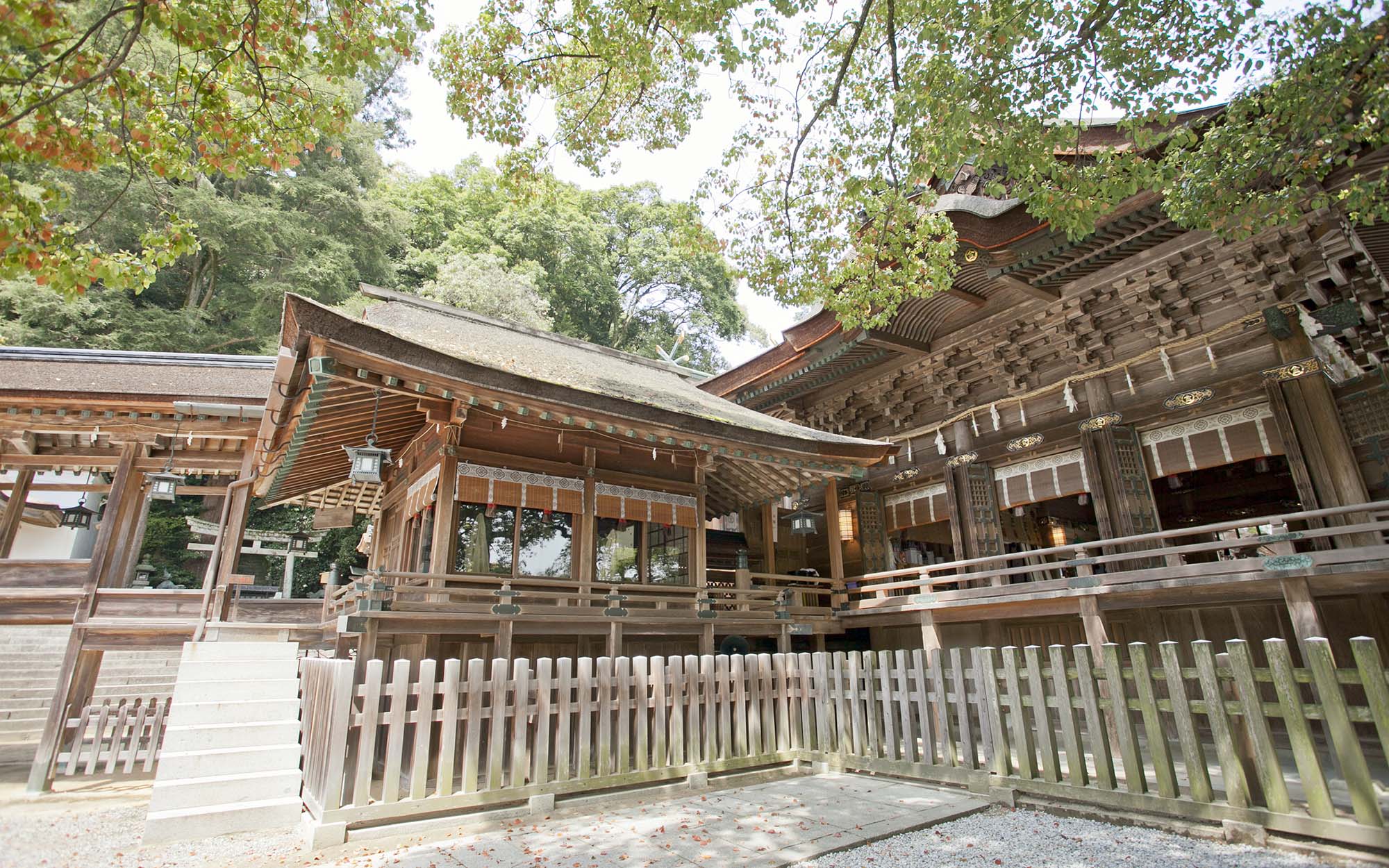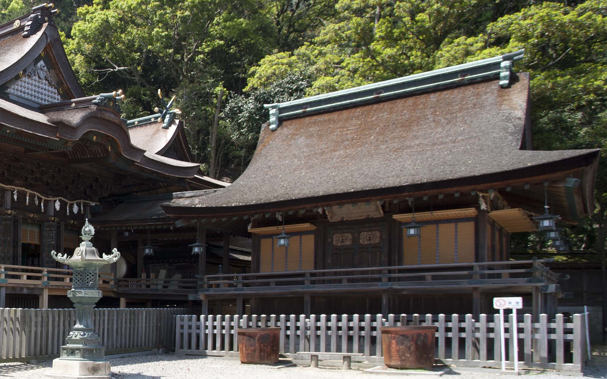 本殿・中殿・拝殿の造りは清素を主とし、檜材が用いられた大社関棟造、檜皮葺です。
