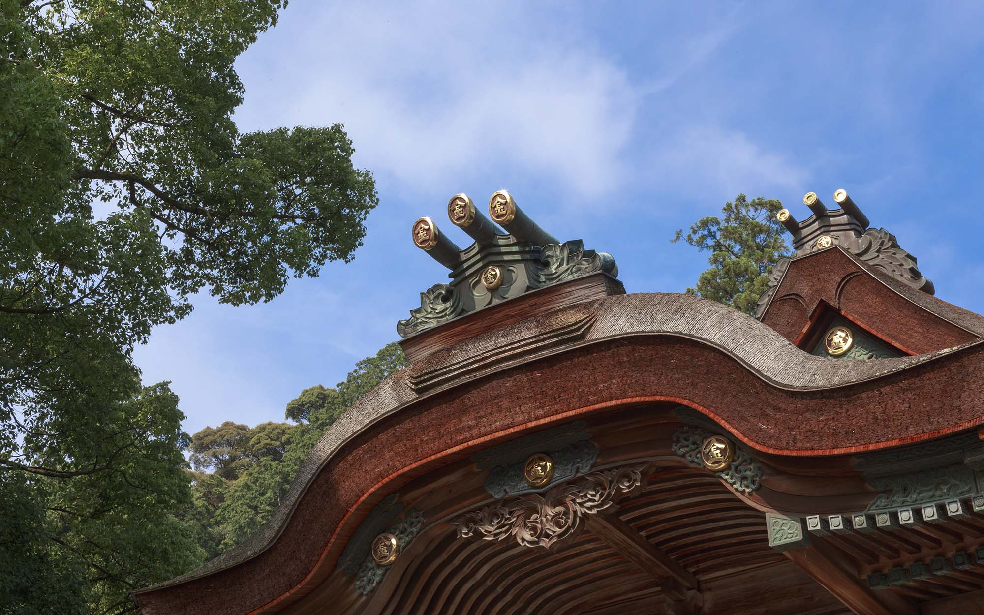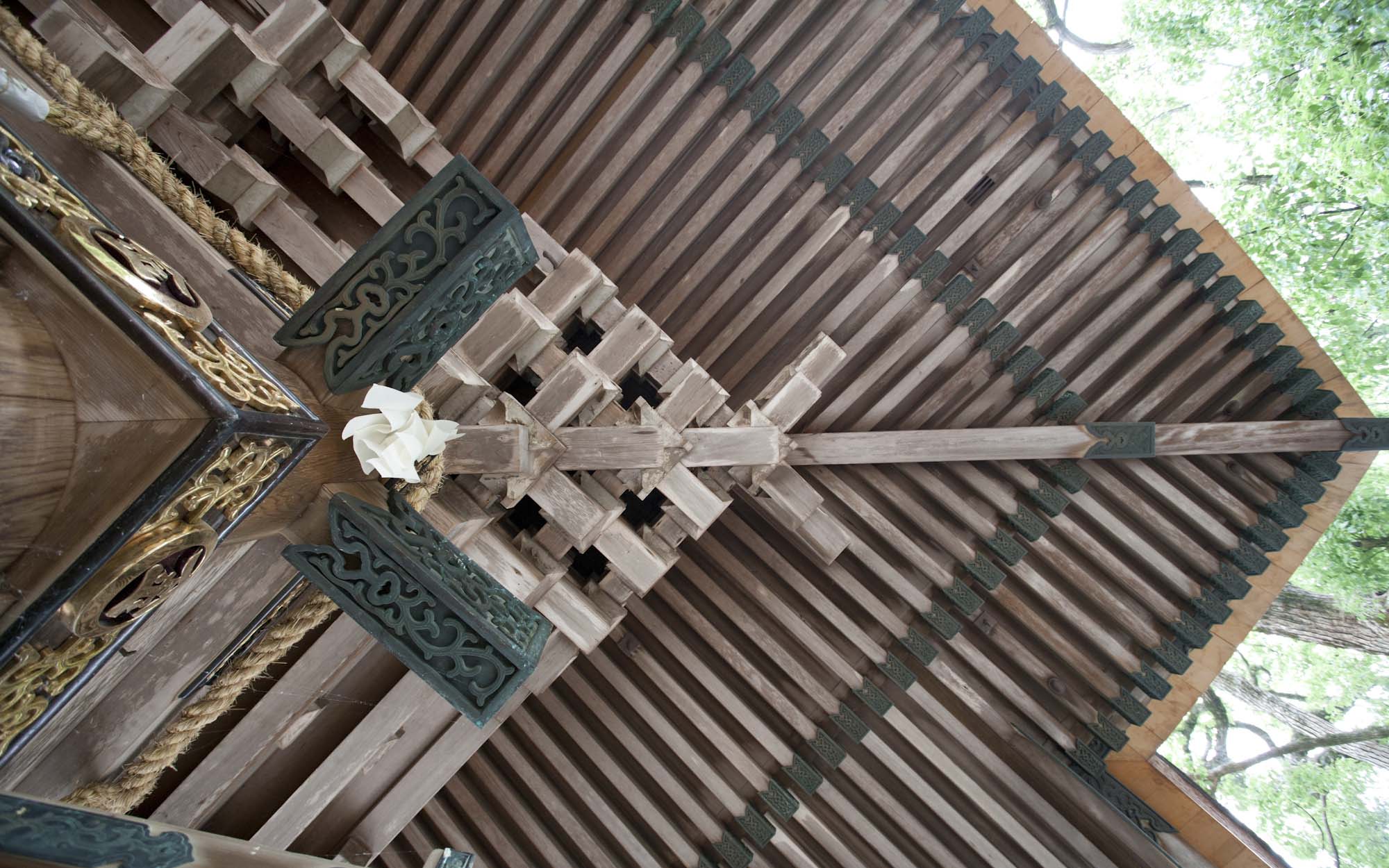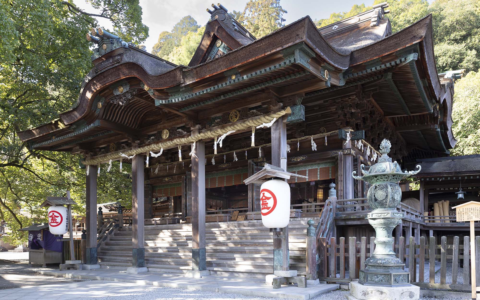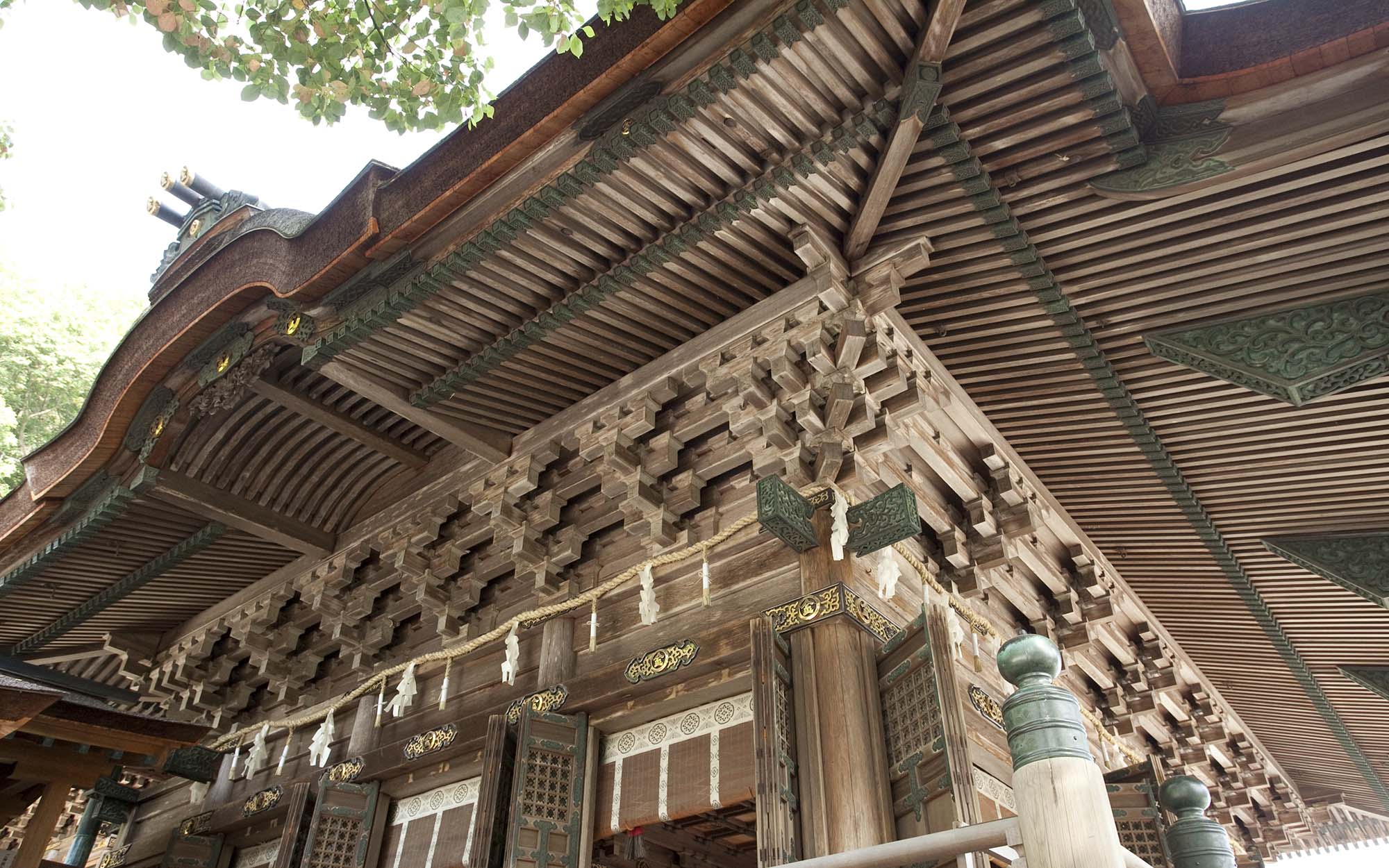 本殿・中殿・拝殿の造りは清素を主とし、檜材が用いられた大社関棟造、檜皮葺です。