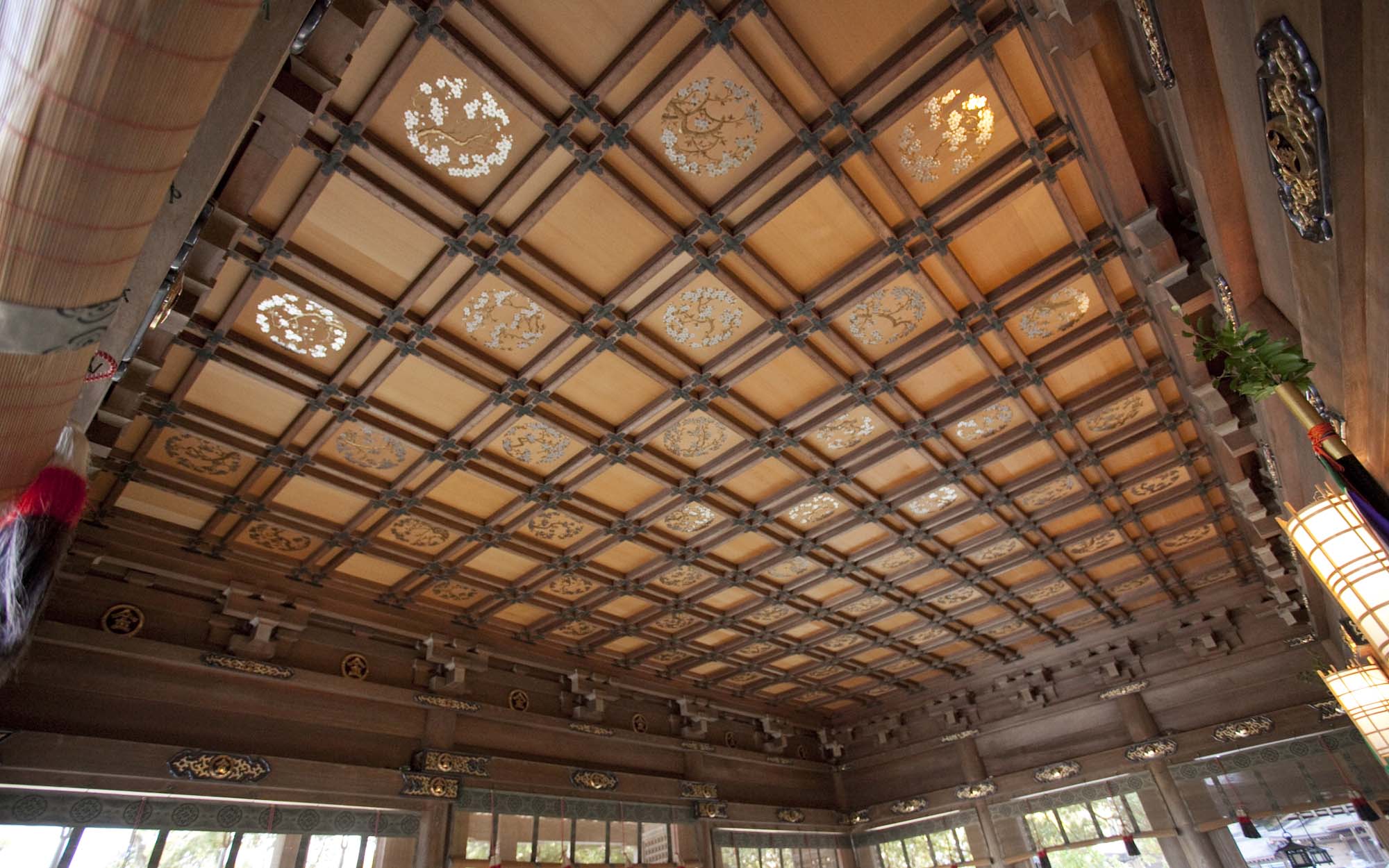 本殿の左右の壁板と、本殿・中殿・拝殿の天井に桜樹の蒔絵が施されています。