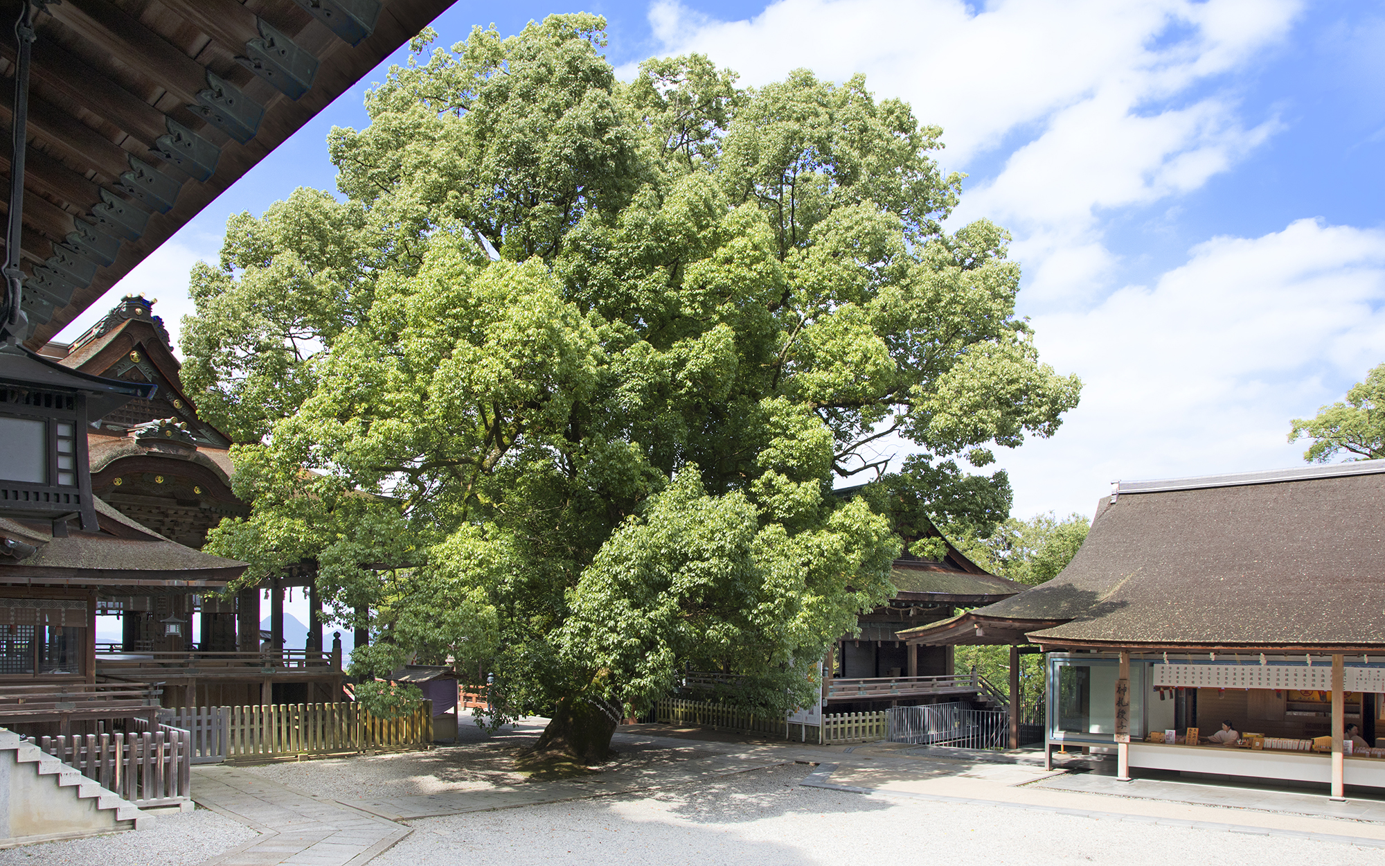 御本宮の横にある大木は、御神木のクスノキです。幹の周りは約5メートル、高さは約25メートルあります。