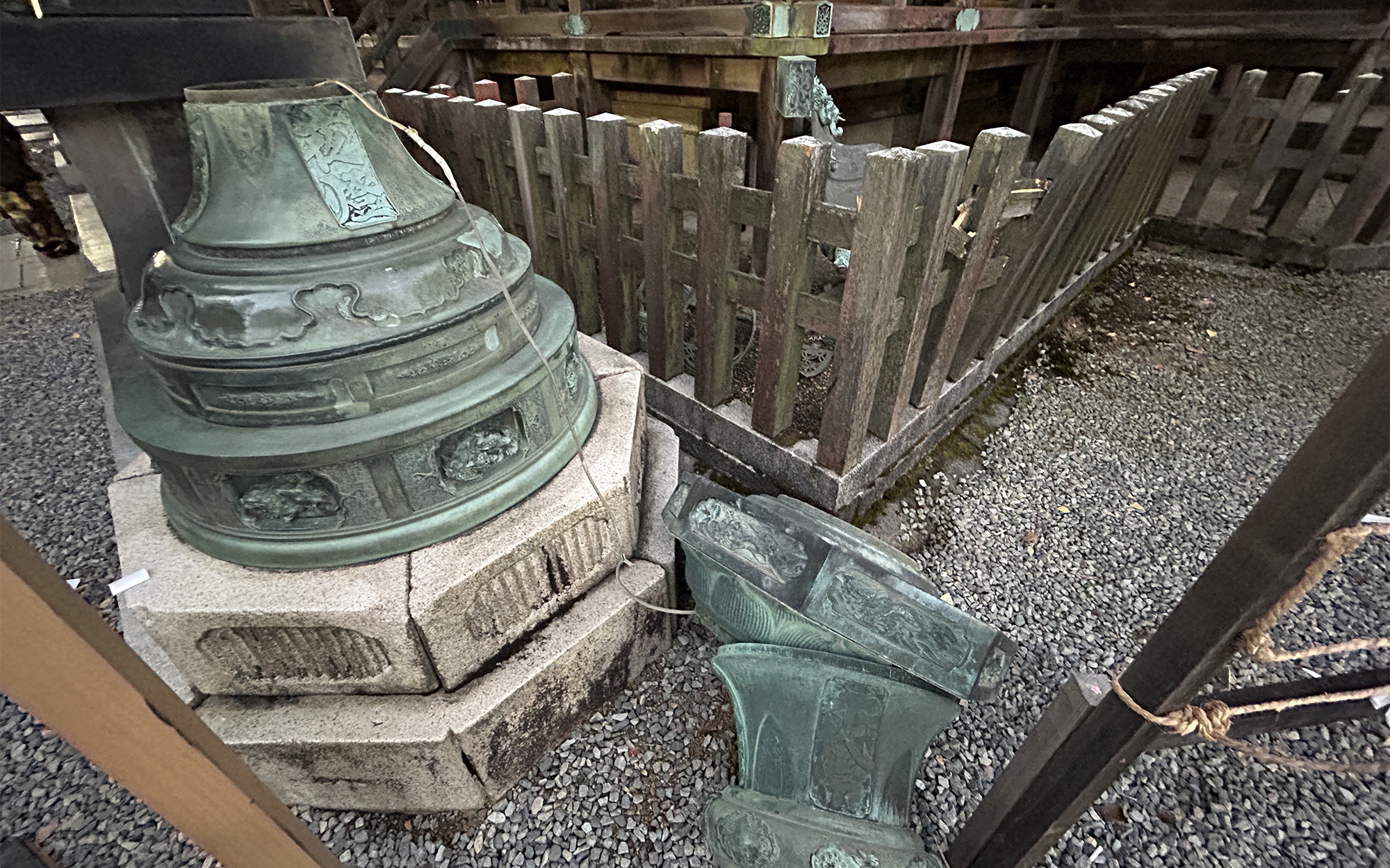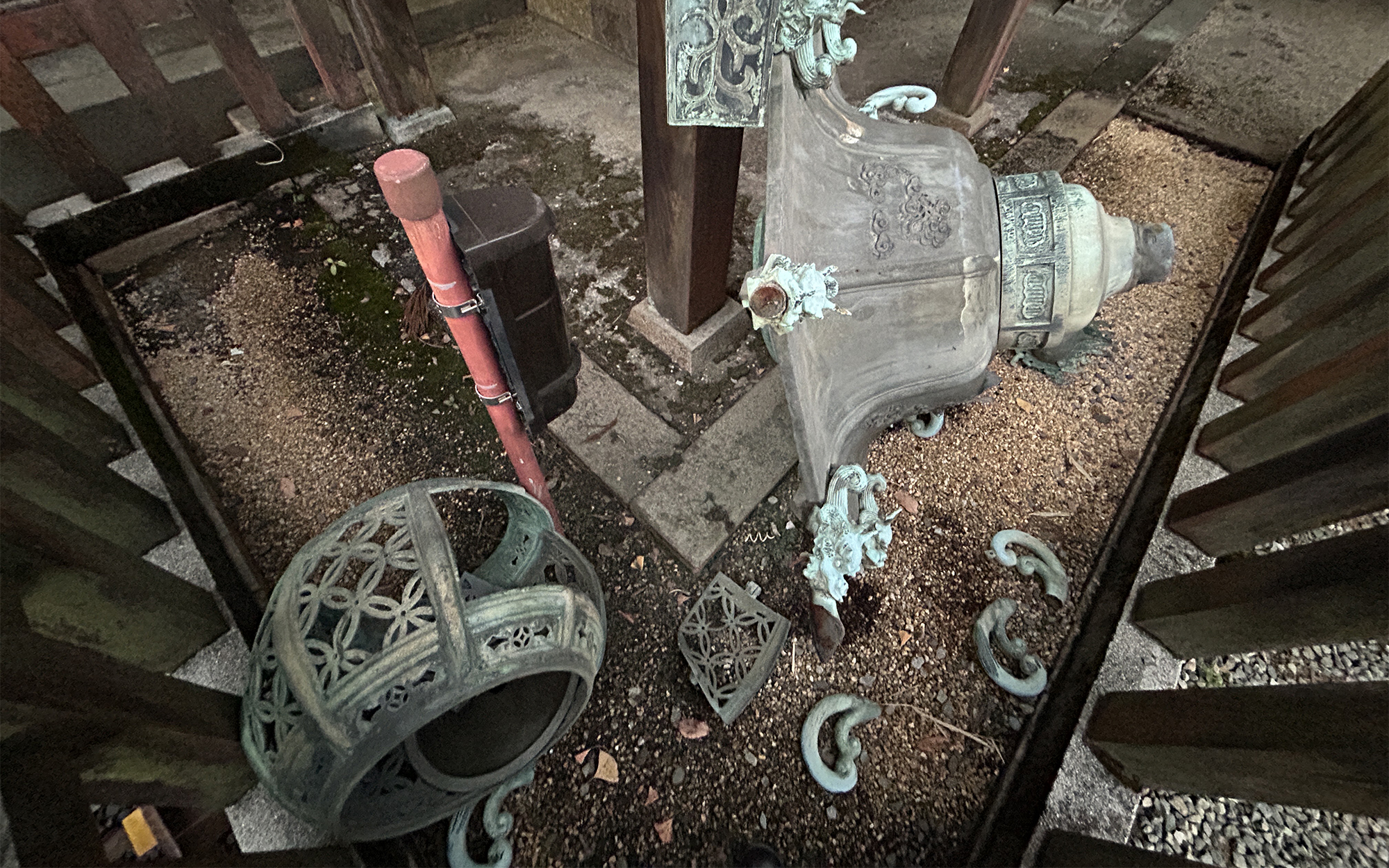 本年元日、新年のお参りの皆様で境内が賑わう中、三穂津姫社前の、国指定重要有形民俗文化財 青銅製灯籠が、若者の軽率な行為により倒壊し、蕨手飾りが折れるなどの被害が発生しました。
