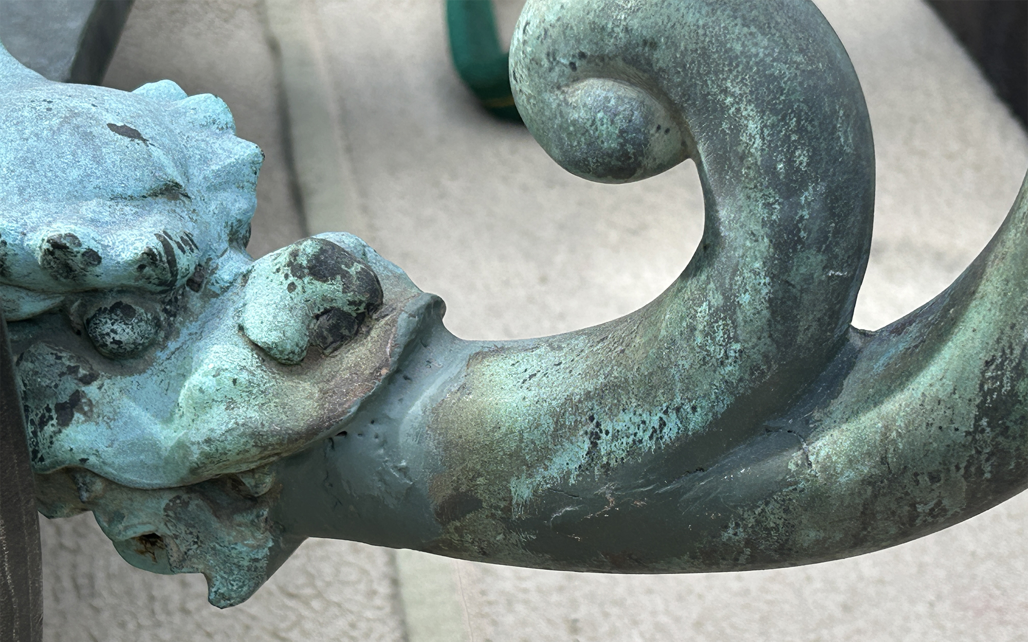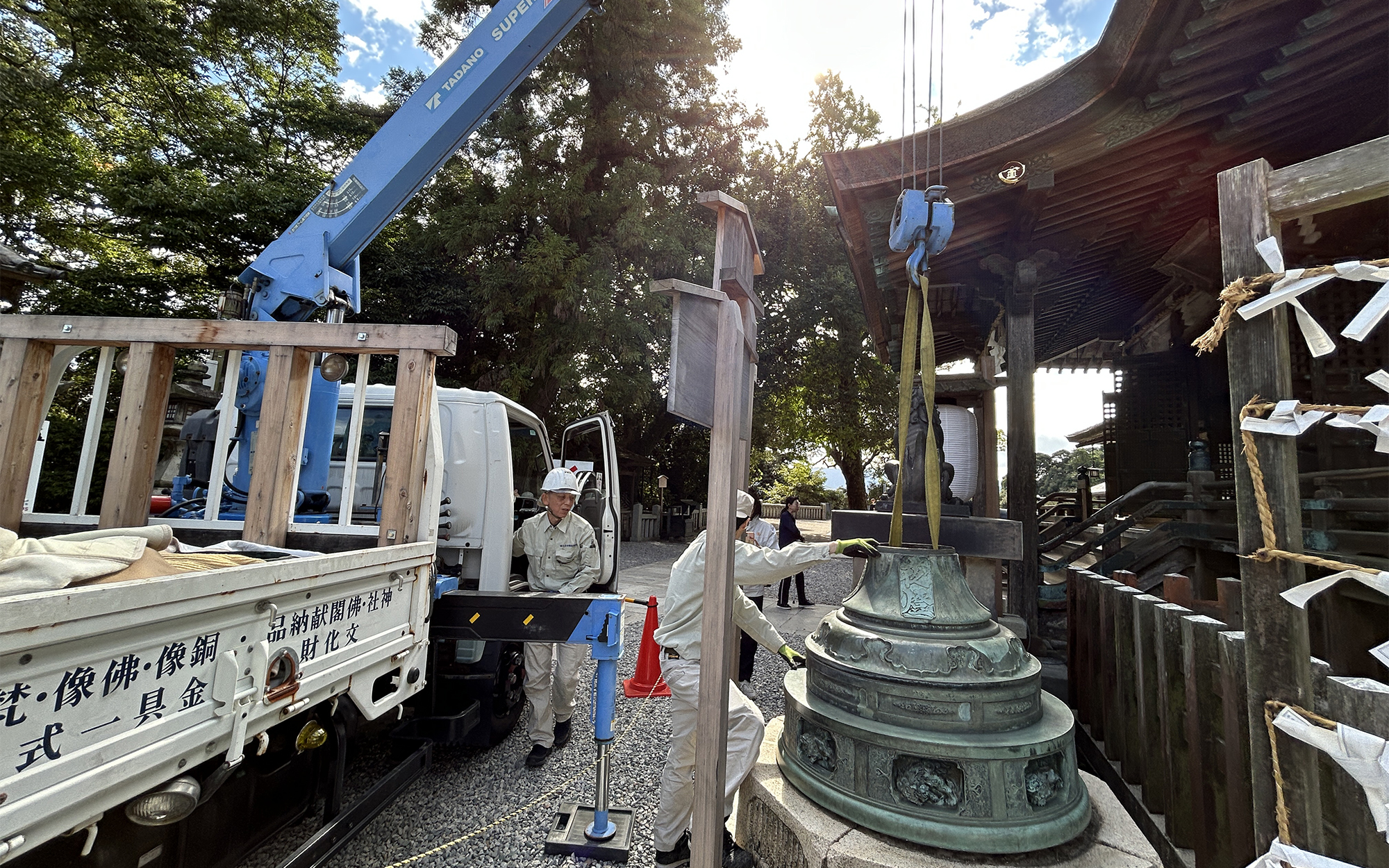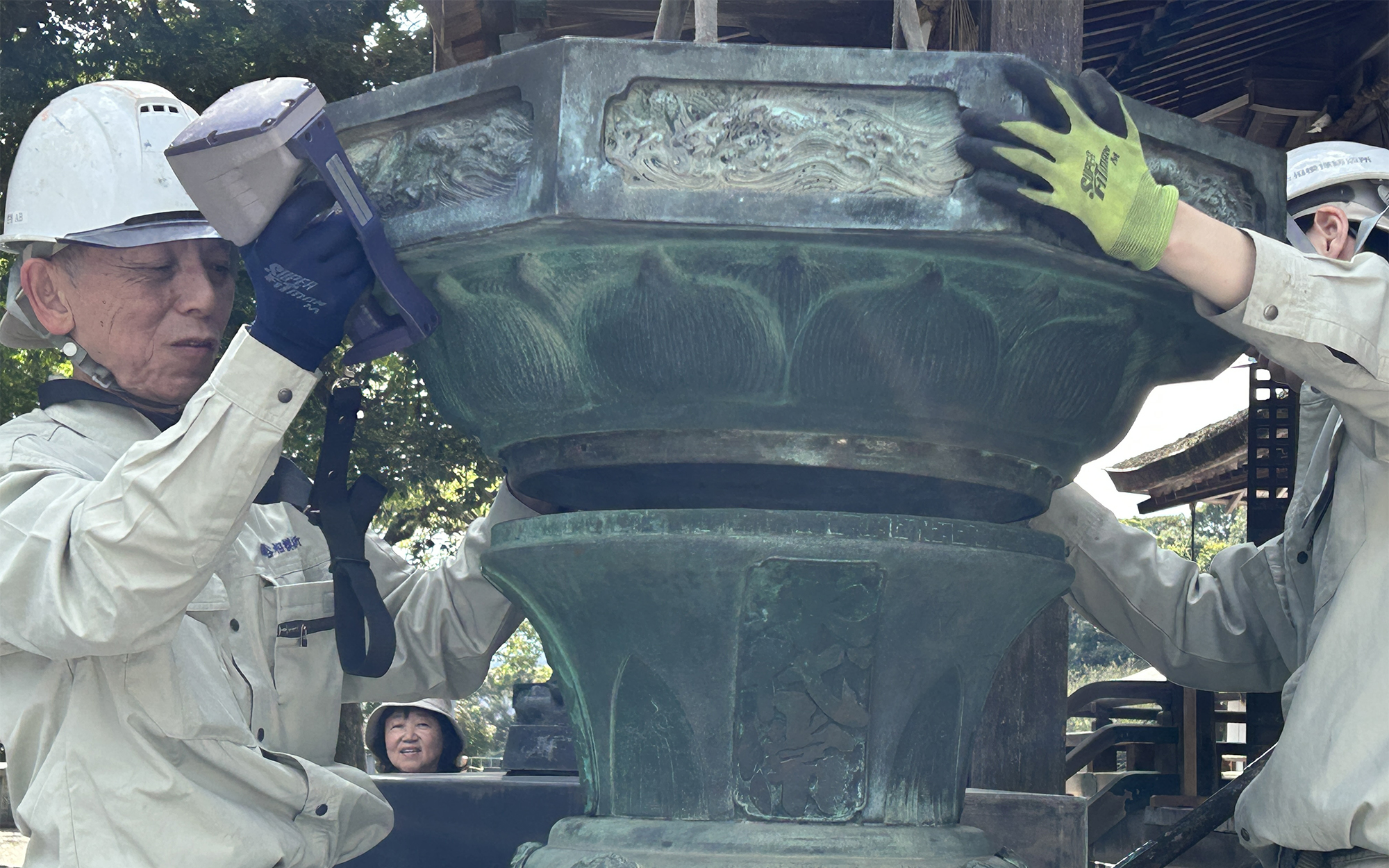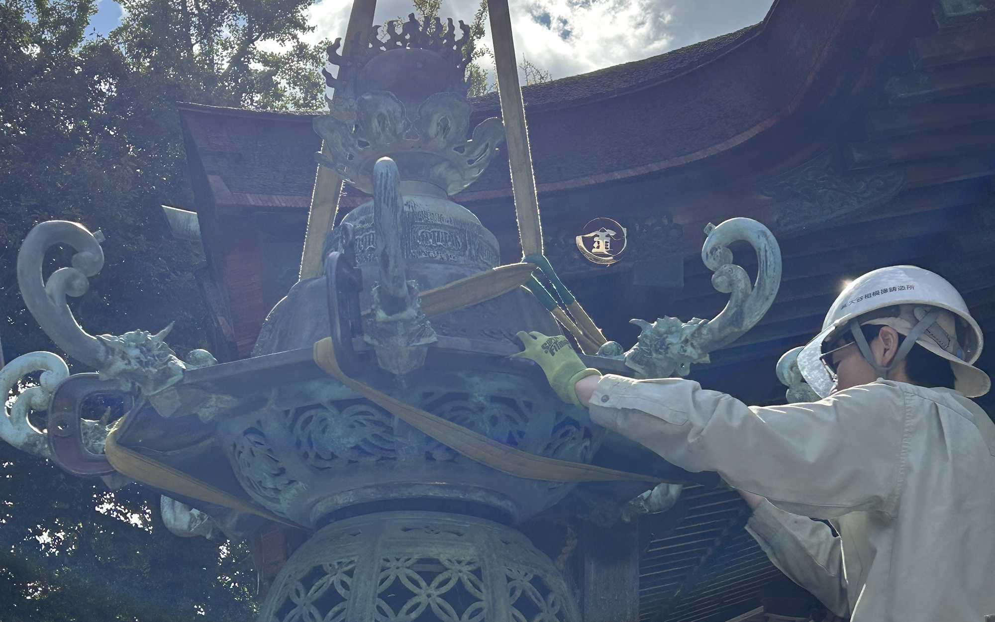 大谷相模掾様は、現在も当宮が金属製灯籠の修理をお願いする業者様としてお付き合いが続いており、今回の修理でも、部材の接合や歪みの修正などの高度な技術を使って、修理頂きました。